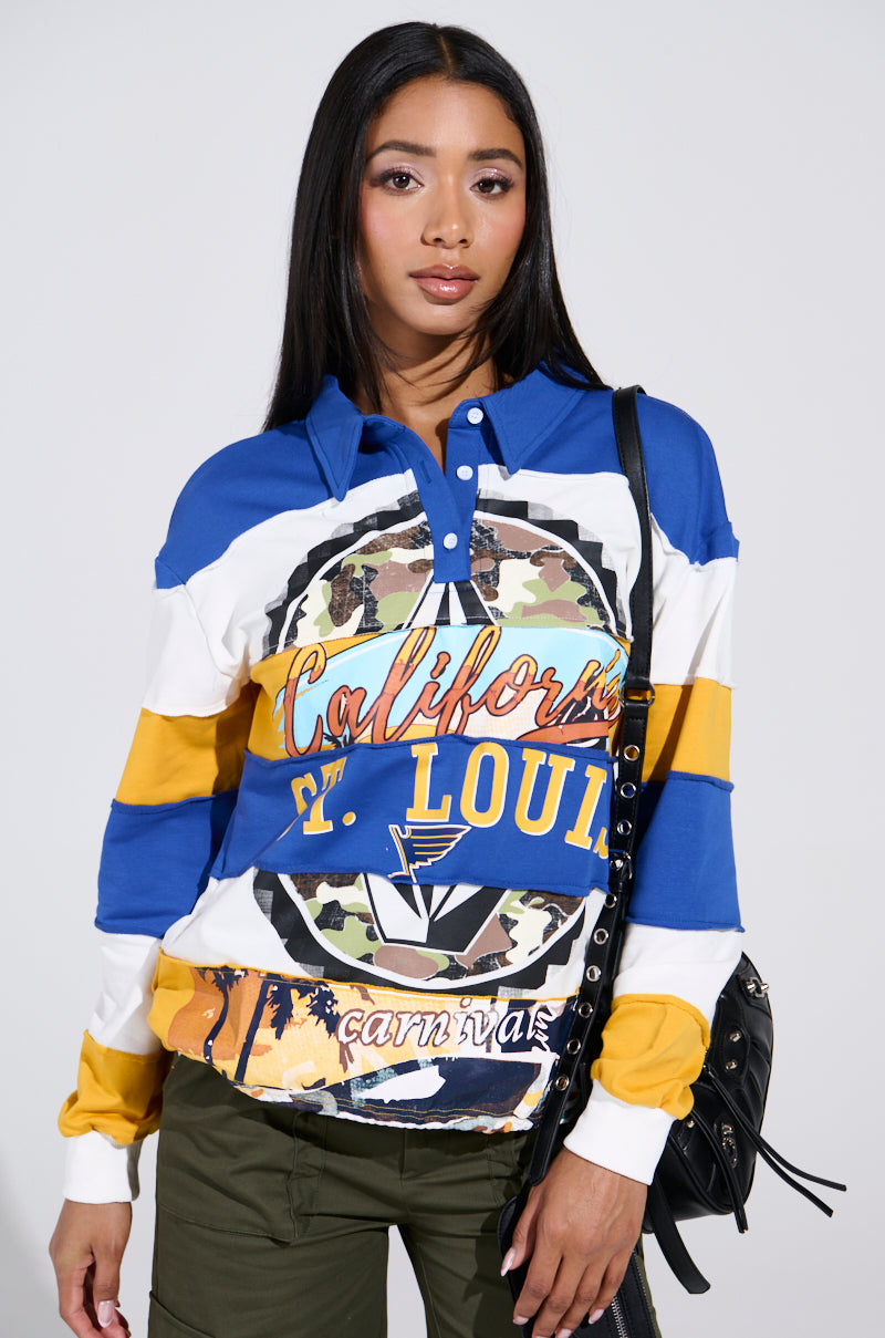 The AKIRA Label All Over The Place Polo is a colorful collision of bold style and vintage energy. Featuring wide horizontal color blocking in cobalt blue. mustard yellow. and white. this rugby-style top is anything but basic. The front boasts graphic text reading "California St. Louis" layered over camouflage and abstract prints. adding a playful twist to its preppy silhouette. Finished with a classic collar and button placket. this piece brings retro varsity vibes with a modern edge.