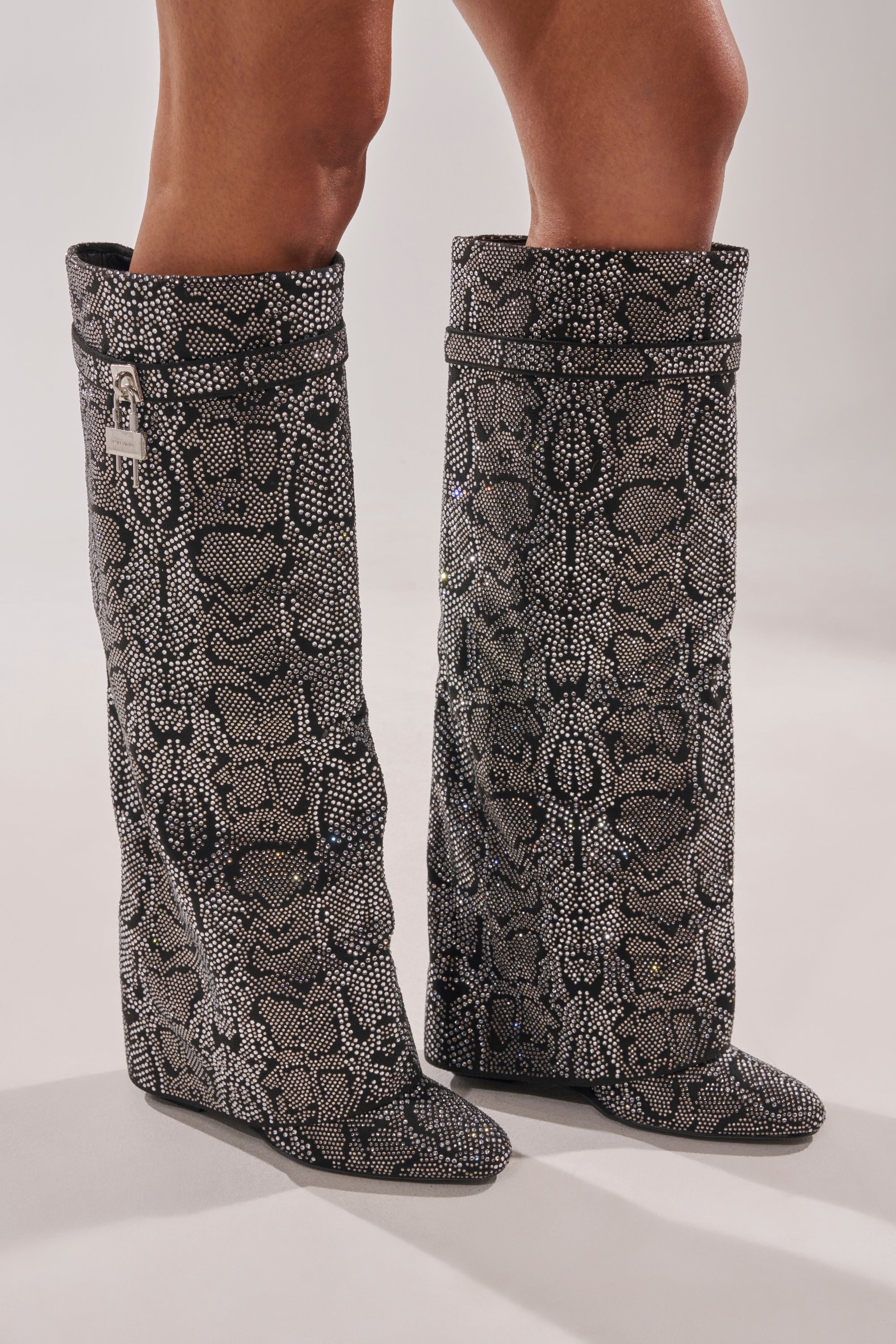Glamour with a bite. The AZALEA WANG Capricorn Rhinestone Snake Pattern Wedge Fold Over Boot is crafted from a suede-like fabric and adorned with dazzling rhinestones arranged in a snake pattern. It features a knee-high fold over shaft. a pointed toe. a slightly concealed wedge heel. and a belt accent at the top shaft with a dangling silver-tone buckle detail. Complete with a pull-on fit.