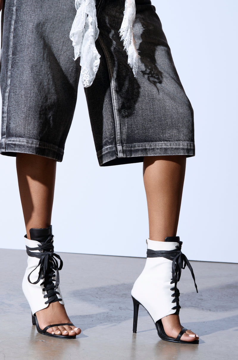 A chic sandal bootie for your shoe-drobe. Amp up any outfit with The AZALEA WANG Nolyn Heeled Sandal. This hybrid style features a faux leather midsole. a coordinating toe bad. an open almond toe. and a slim stiletto heel. Complete with a woven textile mid-calf shaft. a lace up design. a padded faux leather tongue. and a back ankle zipper closure. Style with denim shorts. a corset top. and a long trench coat for a finished look.