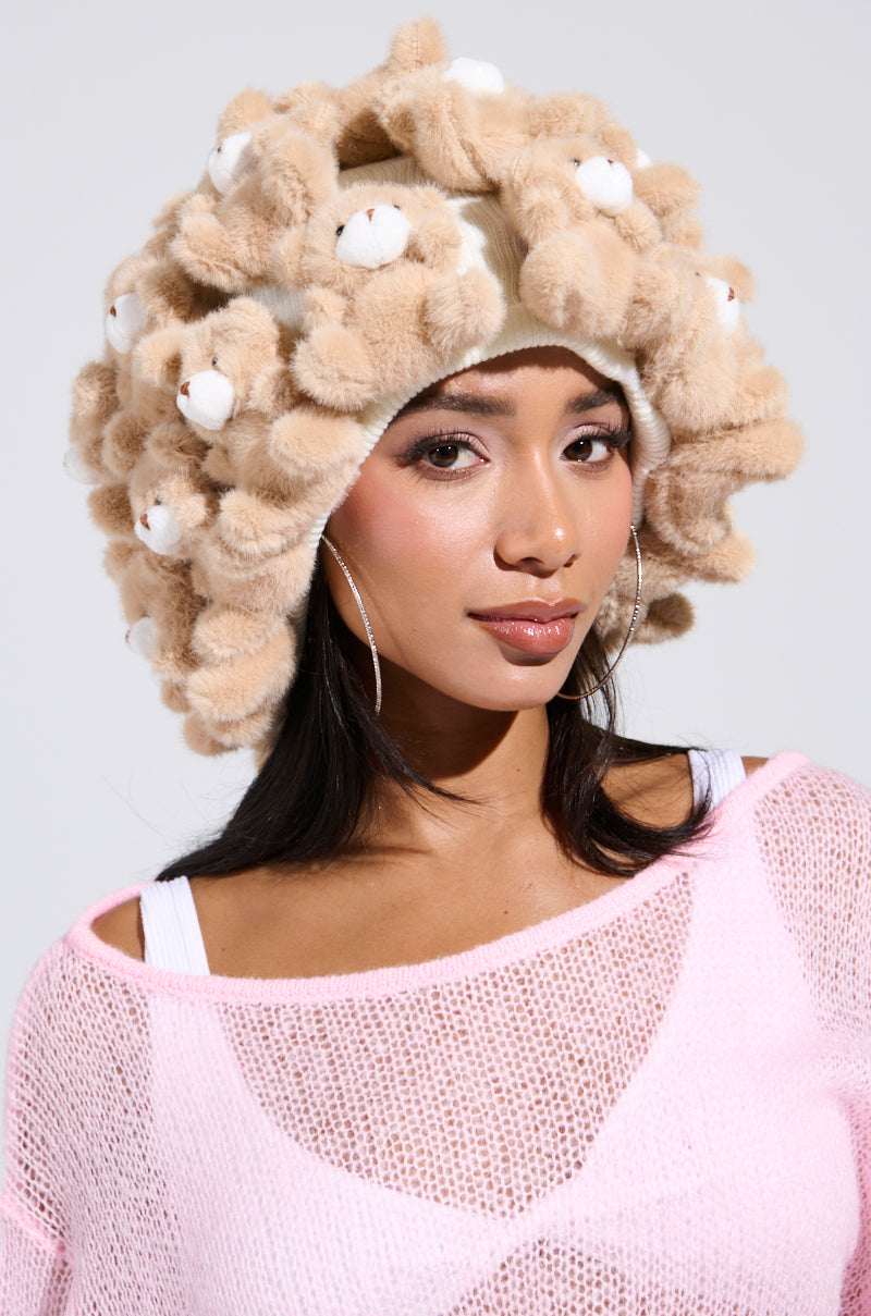 Look paws-itively cozy with The AKIRA Label Beary Babe Beanie. This adorable statement piece features a stretchy ribbed knit base with a domed crown and plush. playful bear appliques covering its entirety. Complete with a rounded. oversized silhouette. and a pull-on fit.