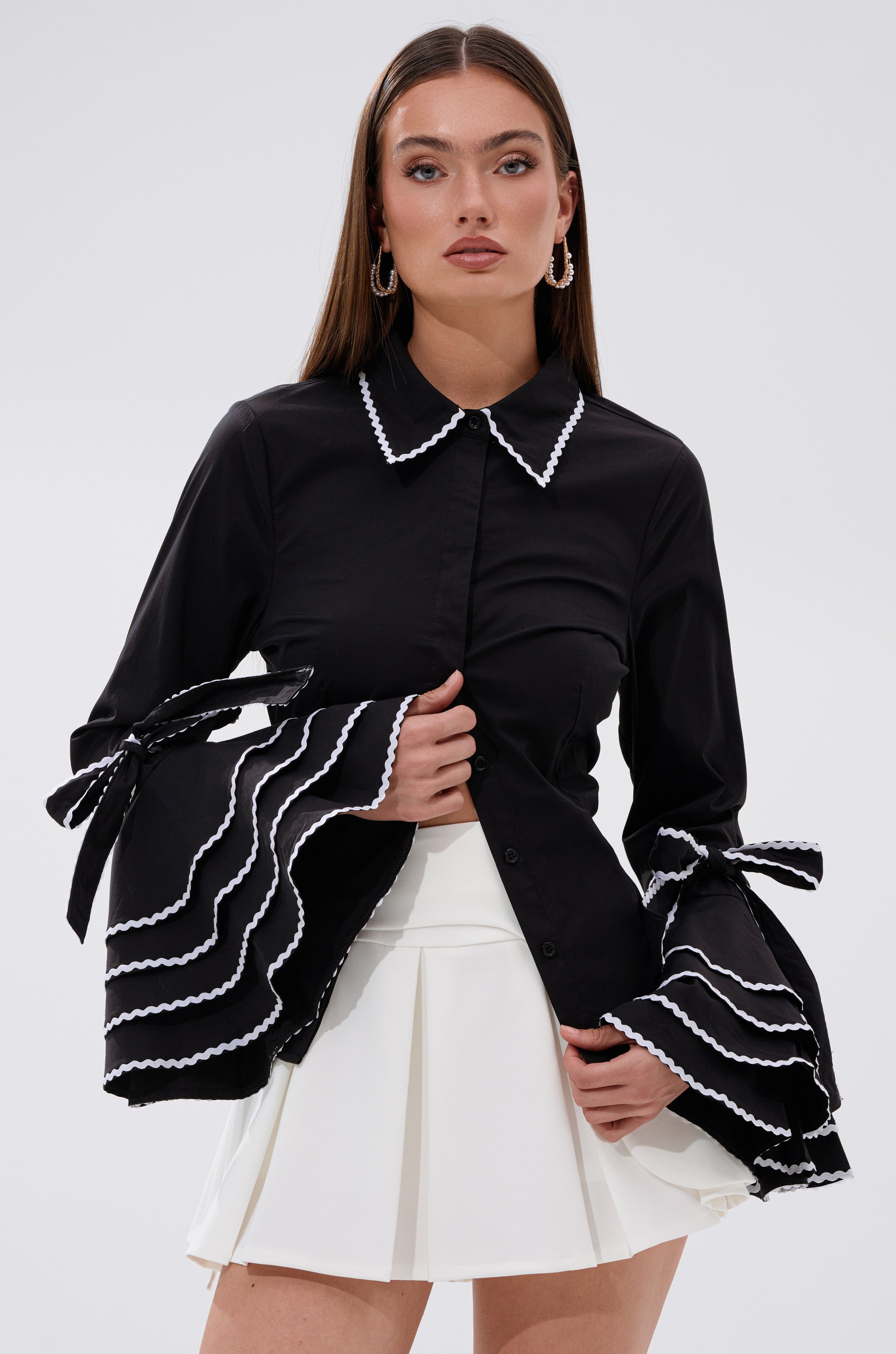 Climb the ladder of success in The AKIRA Label Business Only Button-Down. This elevated interpretation of a classic silhouette is crafted from a crisp cotton-blend and features a tailored. curve-skimming fit. princess seam detailing. and a hidden button-down front placket. Complete with a pointed collar with white squiggly trim. and long. dramatically flared bell sleeves with self-tie bows and tiered ruffles embellished with coordinating. squiggly contrast trim. Pair with wide-leg trousers and patent pumps for a polished look.