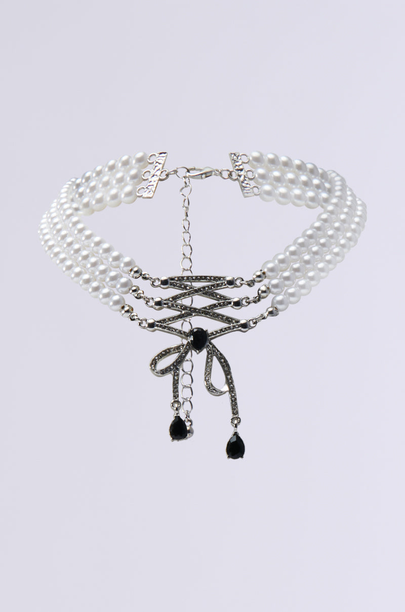 Looking for the necklace of your dreams? Look no further than The AKIRA Label Coquette Dreaming Choker. This darling piece features three strands of pretty pearl beads and a feminine. ribbon-inspired pendant encrusted with sparkling rhinestones and onyx-inspired jewels. Complete with a lobster clasp closure.