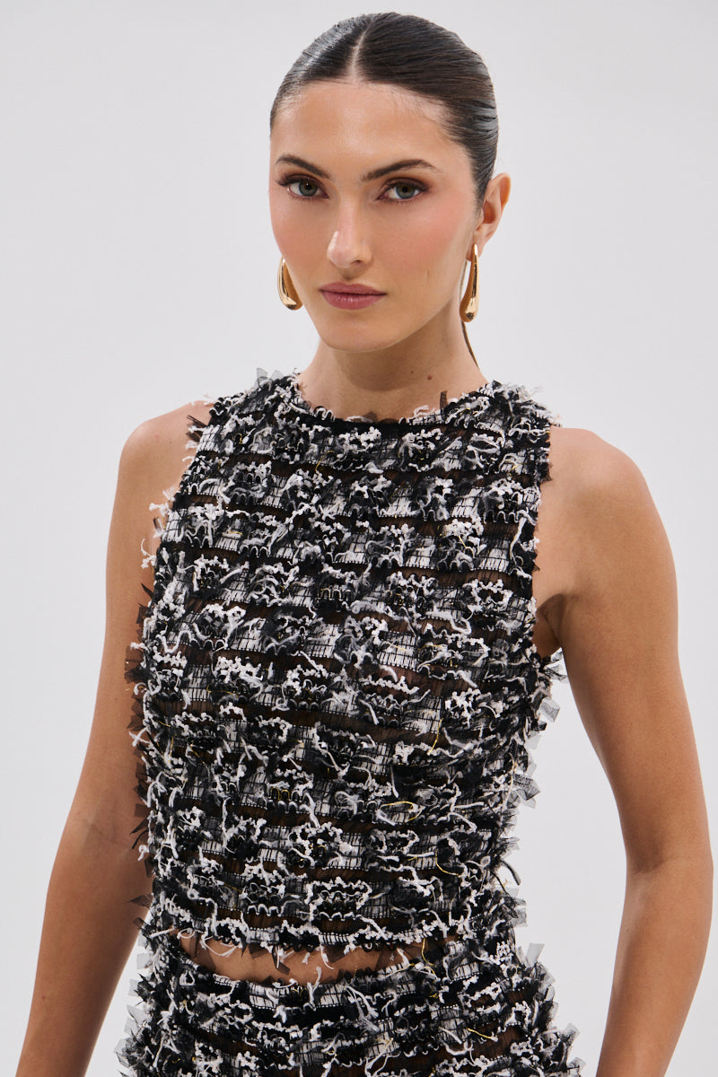 The AKIRA Label Crazy For You Fringe Tank is crafted from sheer. black and white textured mesh with fringe and tulle tassel detailing. It features a rounded neckline. a sleeveless design. a sultry lace-up back panel. and a snug. cropped silhouette. Pair with the matching Crazy For You Fringe Flare Legging. platform sandals. and a clutch for a finished look.