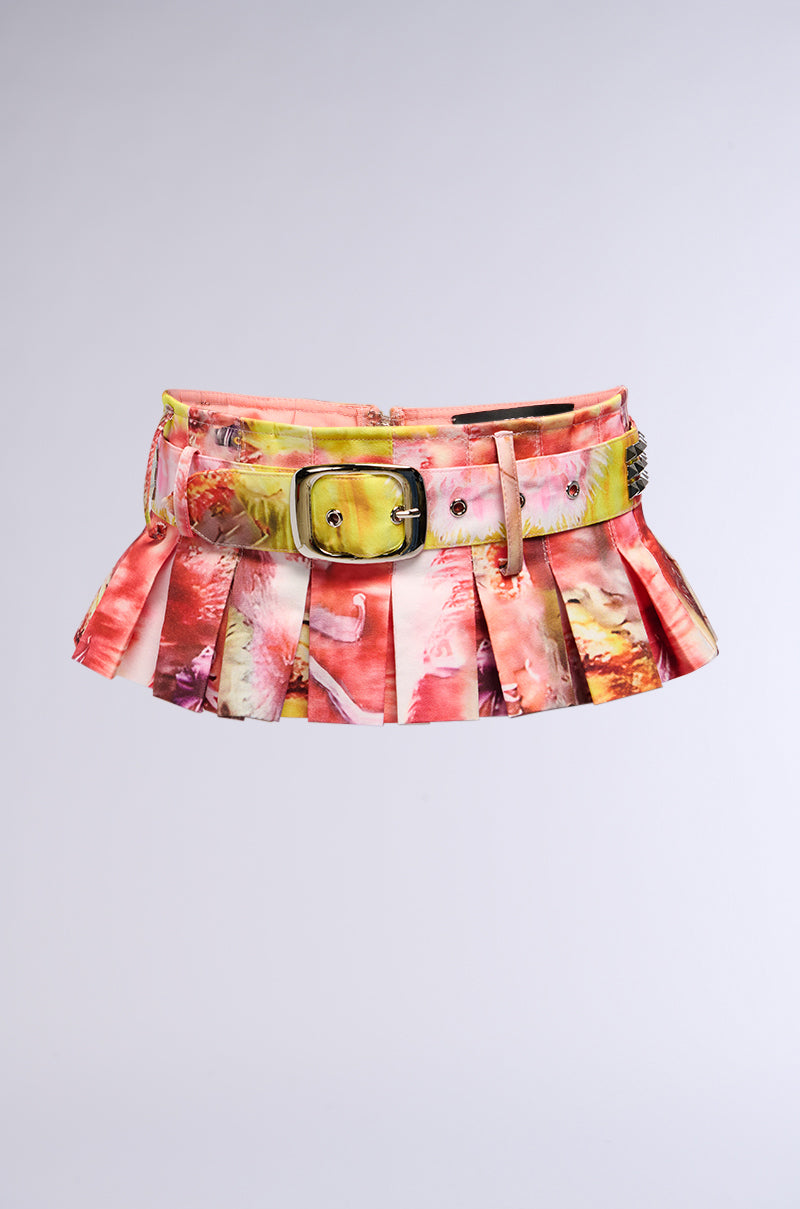 Add the perfect pop of color to any outfit with the AKIRA Label Crazy Love Peplum Belt Skirt. This unique lil' layering accessory features a colorful graphic print. playful pleating. and a chunky. detachable belt with metallic stud detailing. Style it over a baggy pair of jeans and pair it with the matching Crazy Love Fingerless Mesh Gloves for an early-2000's It Girl vibe.