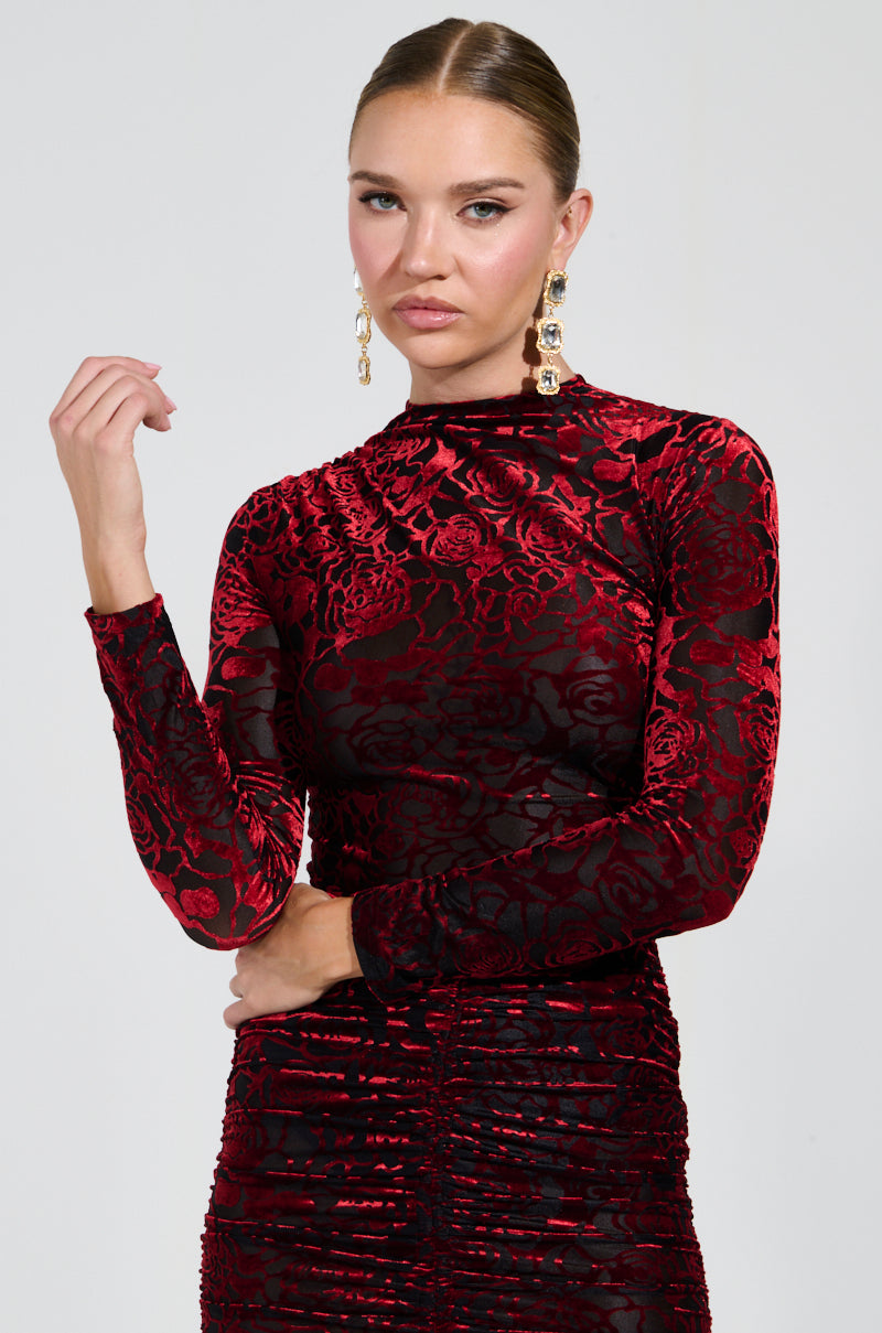 If cute were a crime. you'd be guilty in The AKIRA Label Cute As Can Be Bodysuit. This elegant piece is crafted from a stretchy. semi-sheer mesh base and features a floral pattern throughout made of a sensuous. shimmering velvet fabrication. a mock neck. a sleeveless design. subtle ruching at the top of one shoulder. long sleeves. and a cheeky thong bottom with snap gusset closures. Complete with a curve-hugging fit. and a back zipper closure. Pair with the matching AKIRA Label Cute As Can Be Maxi Skirt. strappy stilettos. and a vampy lip for a finished look.