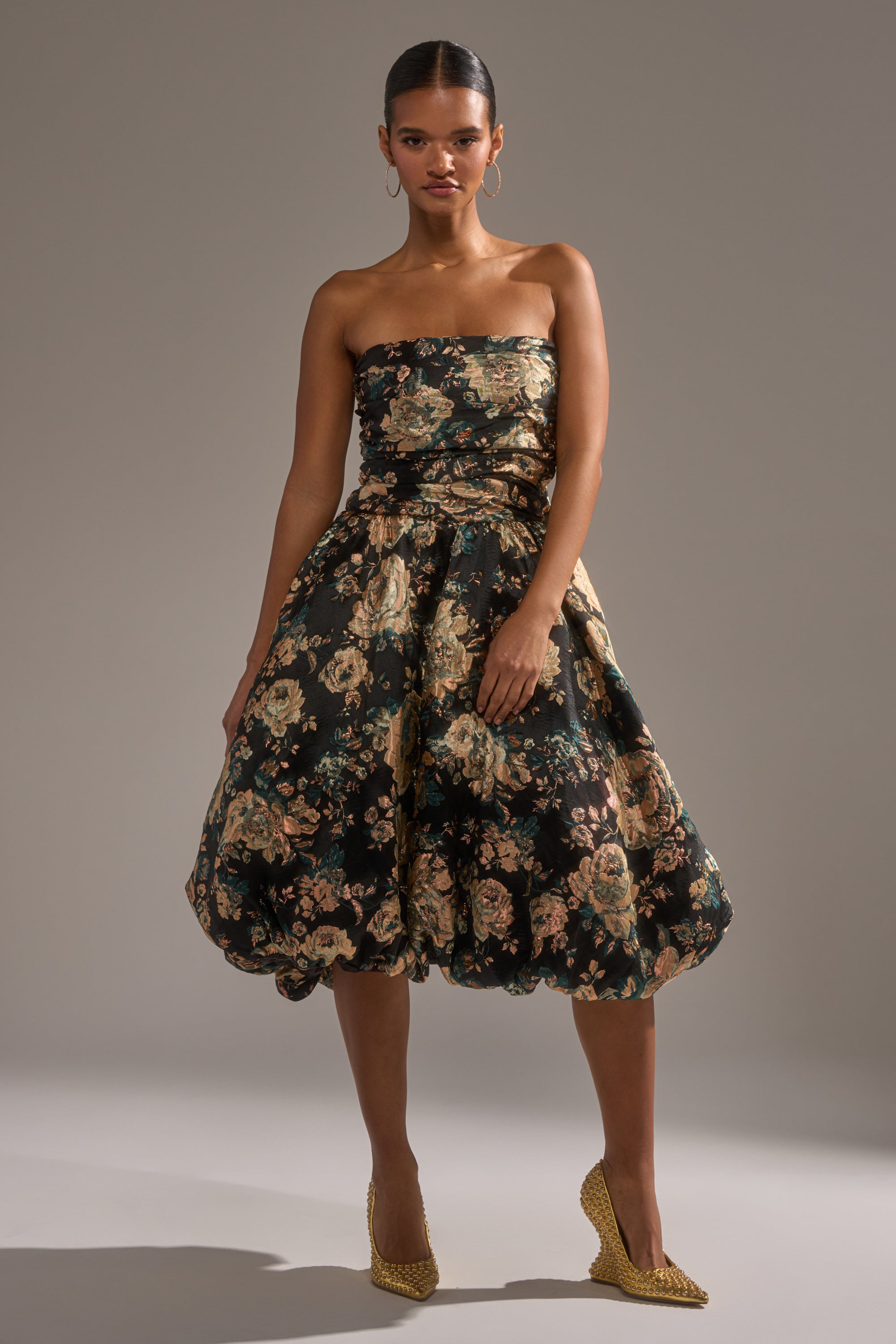 The AKIRA Label Dressed To Impress Brocade Midi Dress is a timeless showstopper designed for elegant evenings and high-glam moments. Crafted from luxurious floral brocade fabric with metallic detailing. this strapless cutie features a structured ruched bodice. a lower back cut out with a self-tie strap. a back zipper closure. a cinched waist. and a flouncy bubble hem skirt with inner tulle padding for added volume. Complete with a midi-length silhouette. Style with stiletto pumps and a clutch to sleigh the holiday season.