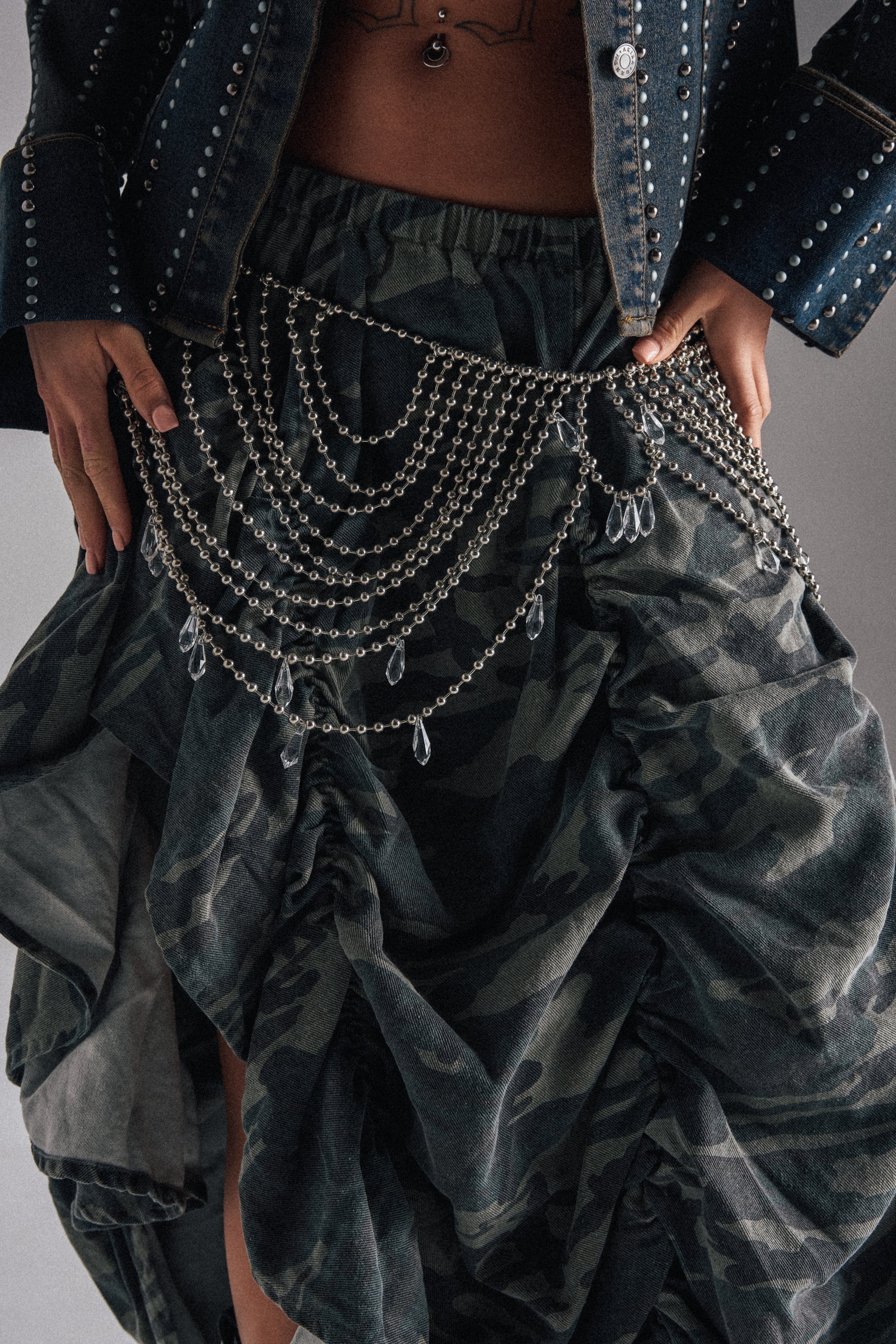The AKIRA Label Drippin Chain Belt is a statement accessory crafted with cascading silver-tone ball chains that drape elegantly around the hips. Designed with layered beaded strands and dangling teardrop crystal charms. this belt creates movement and sparkle with every step. The adjustable clasp closure ensures a secure and customizable fit.