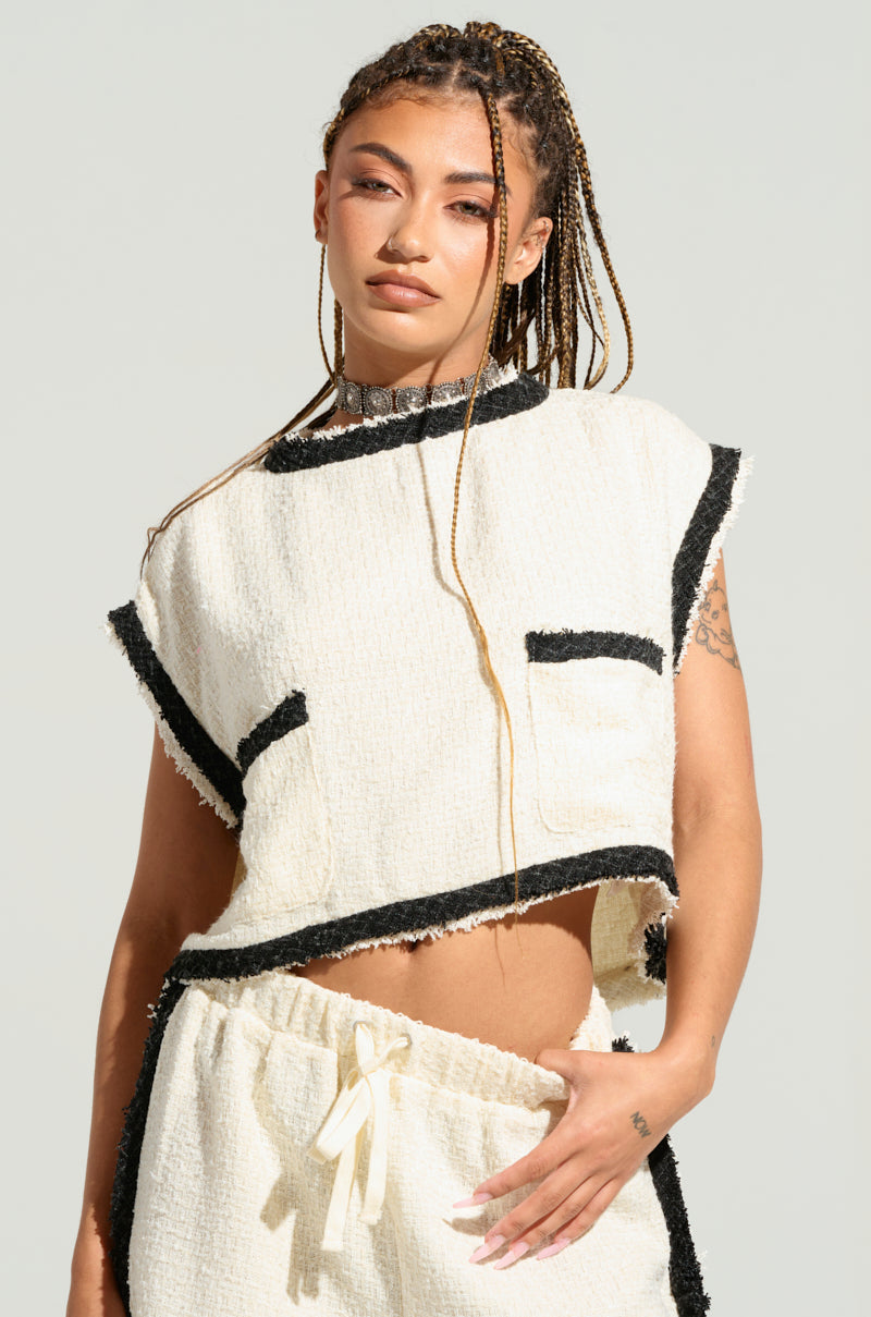 No one can resist you in The AKIRA Label Everyone's Type Short Sleeve Top. This classy style is brought to you in a non-stretch textured tweed-inspired fabrication and features a subtle v-neckline with a tonal button closure at the base of the neck. a sleeveless design. contrast striped trim on the hemlines. and functional dual back pockets on the lower back hem. Complete with subtle distressed detailing. a boxy. cropped silhouette. and a pull-on fit. Pair with the coordinating AKIRA Label Everyone's Type Short and loafers for an upscale ensemble.