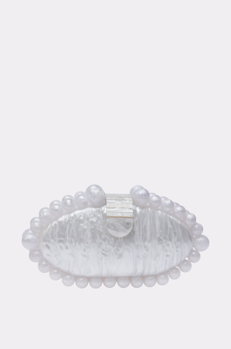The AKIRA Label Expensive Taste Clutch is for the connoisseur of couture. This elegant handbag is crafted from a hardshell acrylic base in an opalescent colorway and features a structured oval silhouette lined with spherical embellishments. a sleek magnetized top strap. a hinged base. and a lined interior. Complete with a removable gold-tone chain link strap for an optional crossbody fit. Pair with a minimalist cocktail dress to elevate your evening look.